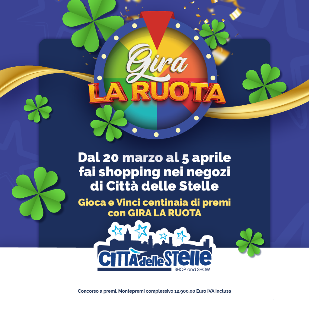 dal 20 marzo al 5 aprile fai shopping nei negozi di Città delle Stelle Gioca e Vinci centinaia di premi! Regolamento concorsoPrivacy concorso Negozi dove si possono spendere i buoni